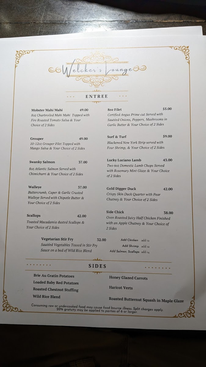 At Welcker's Lounge, the menu shines with superior selections such as expertly prepared salmon and indulgent walley, as well as a mouthwatering prime rib that has patrons raving. Each dish bursts with flavor, complemented by high-quality sides like roasted carrots and scalloped potatoes. The chef’s ability to craft unique sauces, such as the spicy dipping sauce for their whitefish, elevates the dining experience to new heights.